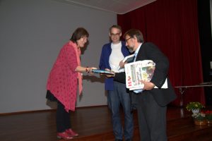 10. Skyggeredaksjonens ledere, Steinar Larssen og Jørgen Rogne, Hamar katedralskole, får bokgave av Elisabeth Sølvberg Aase (arrangementskomitemedlem)